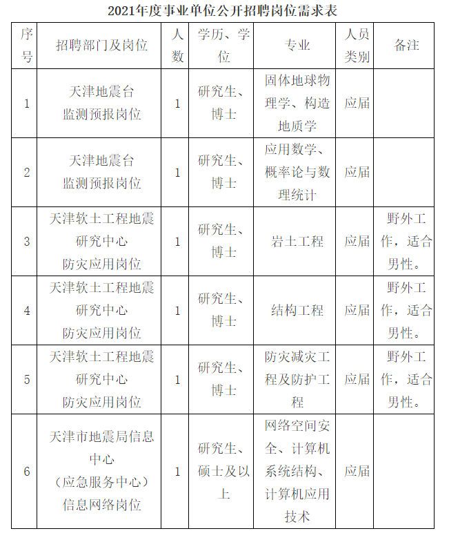 根據(jù)《事業(yè)單位人事管理條例》《事業(yè)單位公開招聘人員暫行規(guī)定》《中國地震局進人管理辦法》《天津市地震局公開招聘事業(yè)單位人員辦法(試行)》等有關規(guī)定,現(xiàn)將天津市地震局2021年事業(yè)單位公開招聘有關事項公告如下。