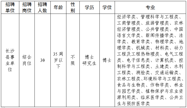 為奮力推進(jìn)“三高四新”戰(zhàn)略,加快打造近悅遠(yuǎn)來人才高地,為長(zhǎng)沙縣未來發(fā)展儲(chǔ)備培養(yǎng)一批高素質(zhì)專業(yè)化人才,根據(jù)《事業(yè)單位人事管理?xiàng)l例》(國務(wù)院令第652號(hào))和《湖南省事業(yè)單位公開招聘人員辦法》(湘人社發(fā)〔2019〕1號(hào))等文件要求,決定面向社會(huì)公開招聘30名具有博士研究生學(xué)歷、學(xué)位的高層次人才,現(xiàn)將有關(guān)事項(xiàng)公告如下: